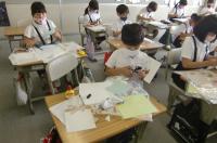 6年生は毛筆の学習で、「旅立ちの時」にチャレンジしています。5文字のバランスに気を付けながら、作品を仕上げていました。